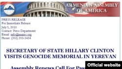 Армянская Ассамблея Америки отмечает, что в преддверии визита Клинтон в Армению представители организации провели встречи с влиятельными членами Конгресса США и чиновниками Госдепартамента, представив им важность посещения госсекретарем Мемориального комплекса памяти жертв Геноцида армян.