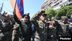 К студентам, проводящим сегодня в Ереване шествие протеста, на улице Ханджяна присоединились десятки молодых людей в военной форме во главе с подполковником, который в руках несет армянский флаг.