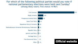 67% респондентов заявили, что если бы выборы состоялись в следующее воскресенье, то они проголосовали бы за партию «Гражданский договор», 10% - за «Просвещенную Армению», 9% - за «Процветающую Армению», 3% - за партию «Сасна црер», 2% – за Республиканскую партию Армении , 2% - за АРФ «Дашнакцутюн».